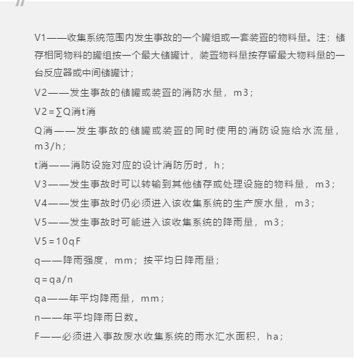 四、《化工建設項目環(huán)境保護設計規(guī)范》(GB 50483-2019),化工企業(yè)應急事故廢水池有效容積計算公式如下: