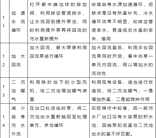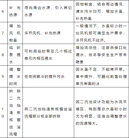 1、環(huán)境溫度降低至零度以下,厭氧、好氧系統(tǒng)的溫度可能會相應降低,但對系統(tǒng)的處理能力影響有限。若確實有影響,對于厭氧系統(tǒng),可以通過提高進水水溫的方法來解決(但是,厭氧反應器的最高溫度不宜超過38.5℃),對于好氧系統(tǒng),可以通過稍稍提高污泥濃度,或者提高溶解氧的方式解決。